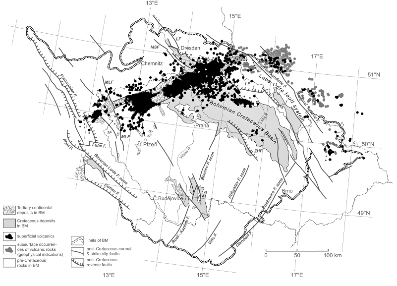 In the Bohemian Massif the occurences of Cenozoic volcanic rocks form an arc-shaped belt which